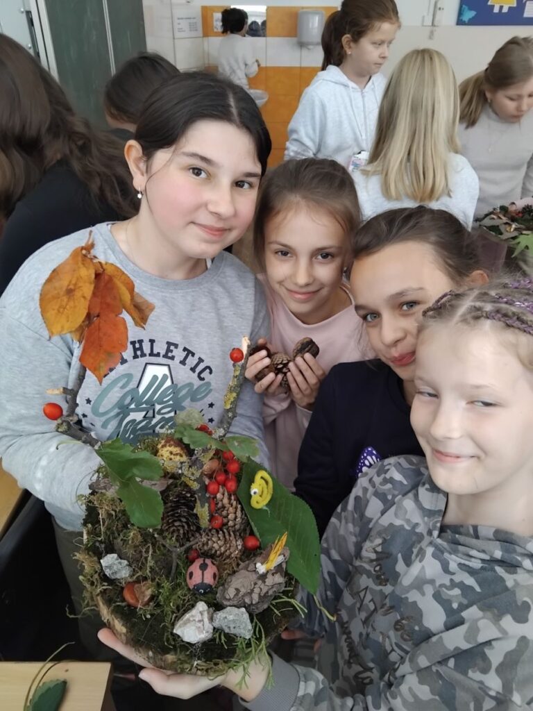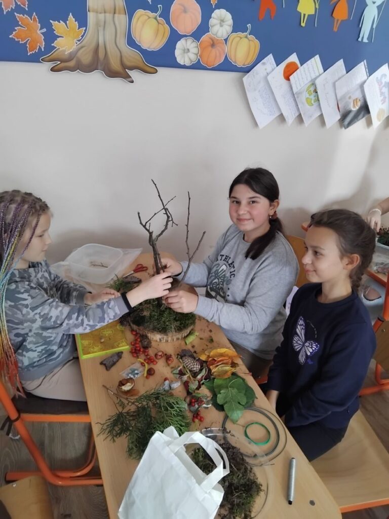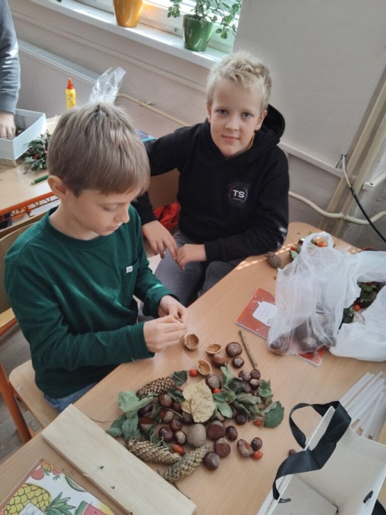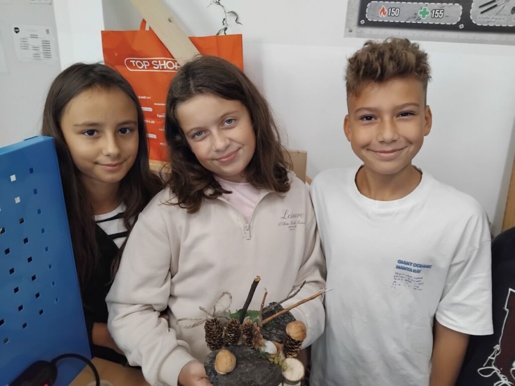 Pod vedením pani učiteliek sa pustili do práce a pripravili prekrásne jesenné aranžmány. Namiesto farieb a štetcov použili poklady, ktoré nám ponúka práve toto ročné obdobie: farebné lístie, gaštany, žalude, šišky, a suché plody.