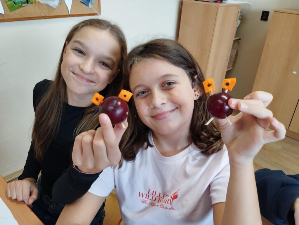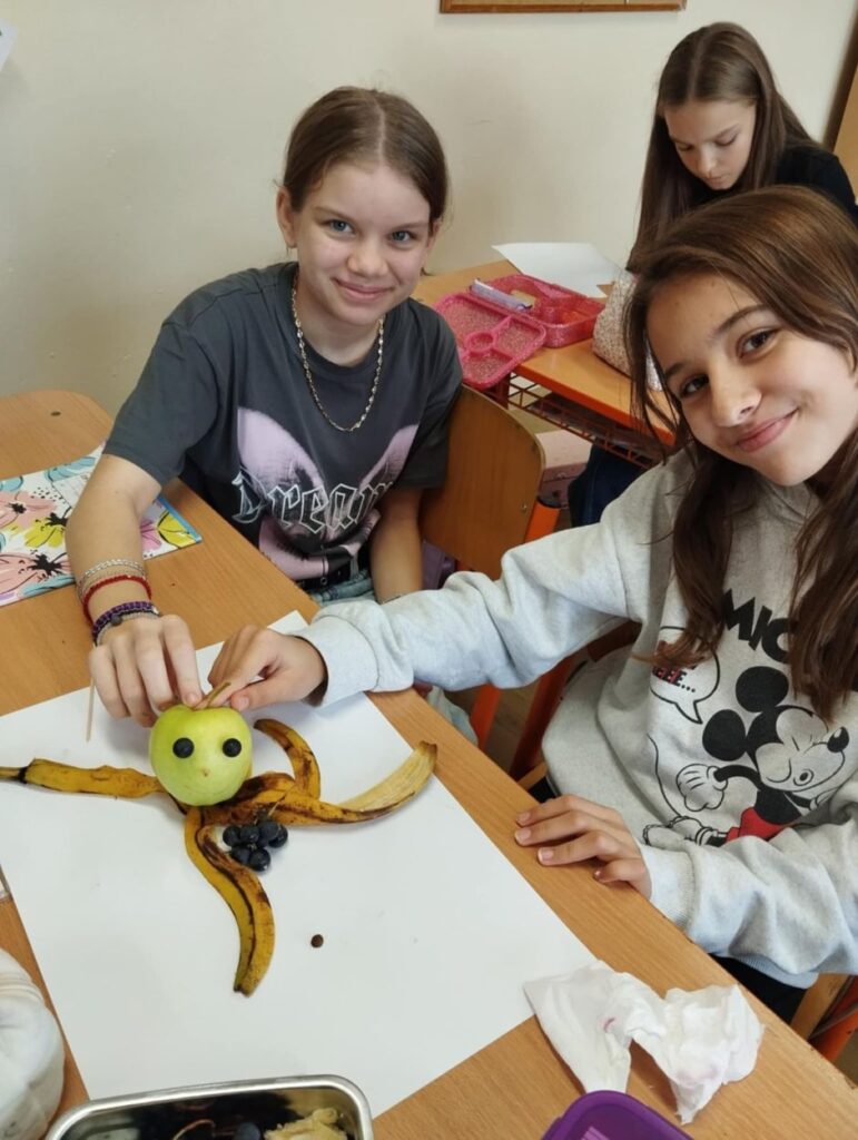 Najlepšia časť hodiny? Počas výkladu novej látky o dôležitosti ovocia a zeleniny vo výžive, mohli žiaci svoje farebné a veselé výtvory zjesť! Bola to odmena za ich kreativitu a tichý dôkaz toho, že niekedy je hranie sa s jedlom nielen povolené, ale priam žiaduce!