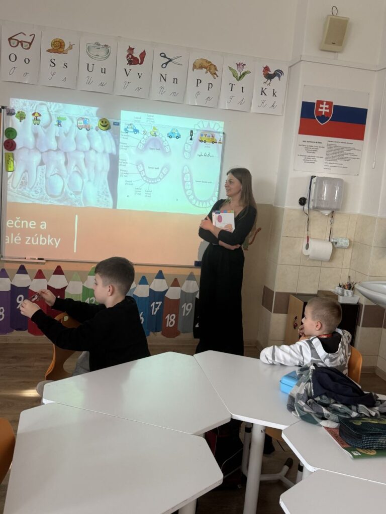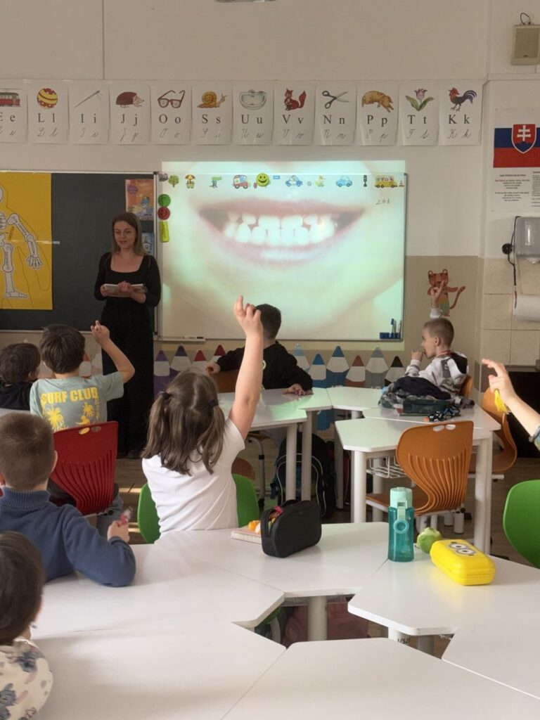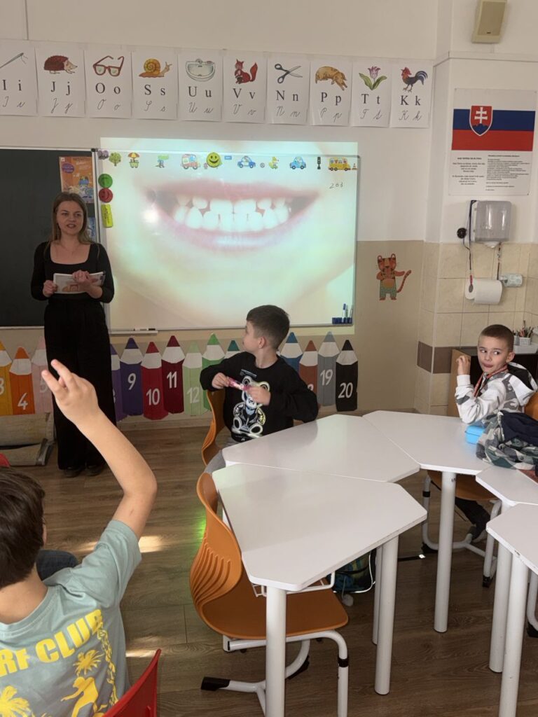Ako prvá nám venovala svoj čas pani doktorka zubárka. Dozvedeli sme sa, že zubná kefka je náš najlepší kamarát a že správna technika čistenia je dôležitejšia než to, ako silno na zuby tlačíme. Ukázala nám, ako vzniká zubný kaz a prečo sa netreba báť preventívnych prehliadok. Odteraz už každý z nás vie, ako si vyčariť úsmev, za ktorý by sa nemusel hanbiť ani filmový hrdina.